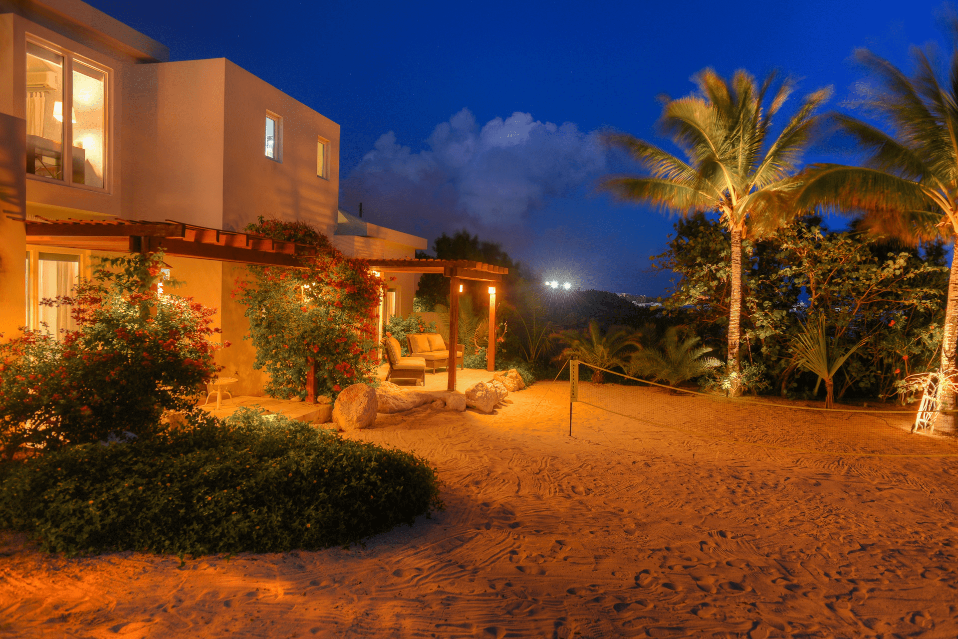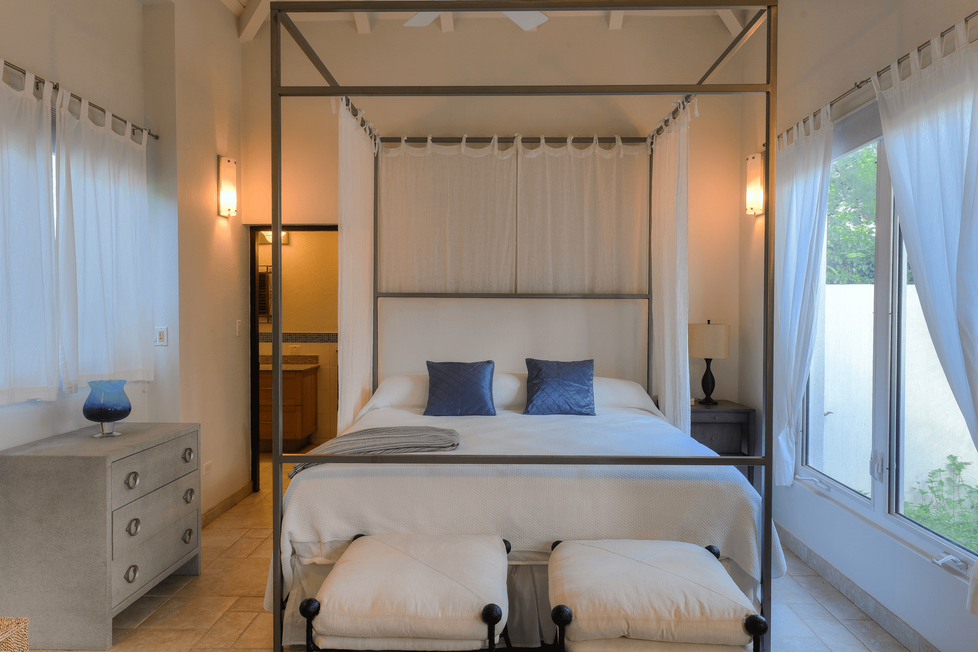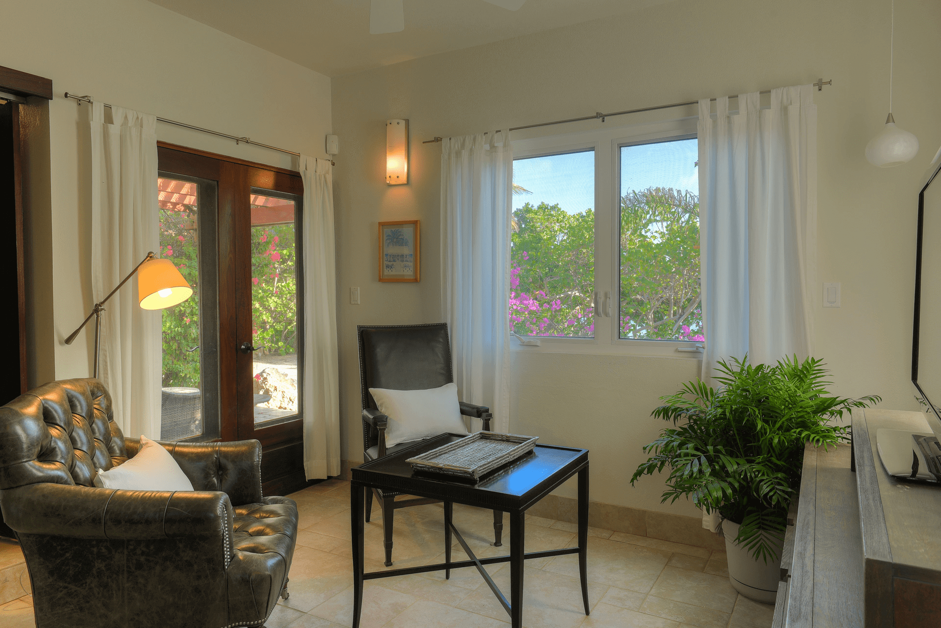 Beach Escape consists of a main house and a guest house. Both buildings have air conditioning throughout. The main house has two bedrooms upstairs with private en-suite bathrooms. The guest building has three self-contained suites, each with bedroom, private en-suite bathroom, and terrace. Beach Escape is a full service, private villa with a daily housekeeping staff and local concierge services. One week minimum rental. 23% government tax and service fee applied to all rates.